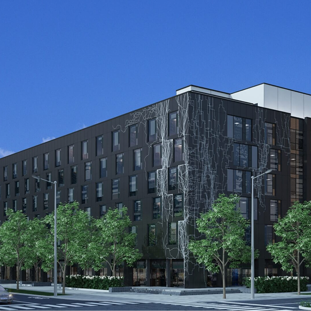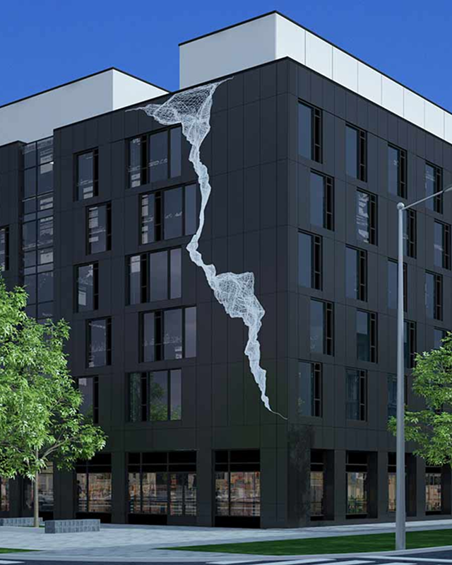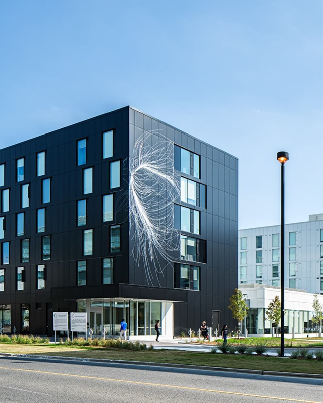 The artwork for the exterior of The Quad was created by renowned Montreal artist, Nicolas Baier. It represents a network, a weaving, branching system that simultaneously evokes references to Ivy League university buildings, and cutting edge scientific research, similar to that performed within these same campuses. The artwork draws its inspiration from a classic tree structure, evoking the great tradition of knowledge institutions.