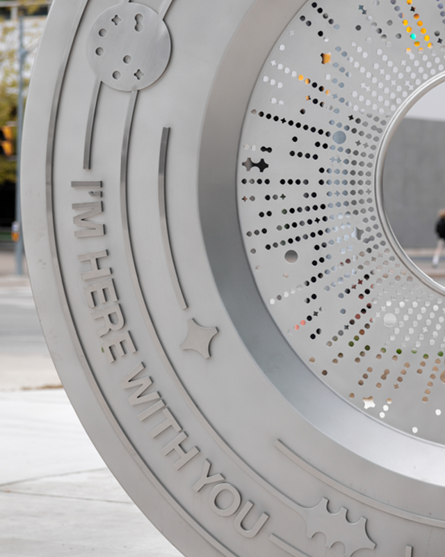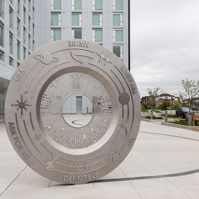 Wheel of Fortune is a community beacon that promotes inclusion and participation while also celebrating the practice of daily life. This decision wheel speaks to the fact that we are constantly making choices, big and small, that impact our experiences. Akin to a Magic 8 Ball or a chance cube, the coin suggests that it can provide viewers answers to questions they may have, as if speaking directly to them. The coin appears as if it has rolled into the courtyard as it lands on the answer definitely. In any given year, one in five Canadians experiences a mental health challenge or illness, and, by age forty, half of all Canadians will have or will have had a mental illness. At some point, mental illness will impact us all. Studies have proven that when people believe they have a choice or are presented with options and can therefore make a decision, they feel better and more equipped to handle adversity.